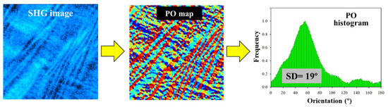 A schematic diagram that shows the use of the structure tensor. SHG images to be processed (left panel); spatially resolved map of POs (central panel); PO histogram showing the frequency of appearance of a certain orientation of the fibers within the SHG image (right panel). The value of SD is also presented for clarity (this is defined as the standard deviation of the PO histogram).