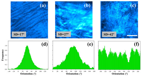 SHG images of non-pathological human corneas (a,b) and a cornea affected by keratoconus (c). Scale bar = 50 μm. (d–f) Histograms of PO distribution for the SHG images of the upper row. These were calculated using the structure tensor.