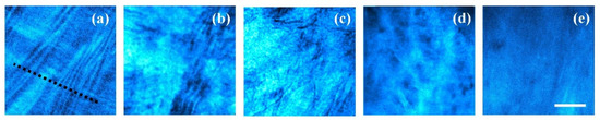 SHG images corresponding to the temporal evolution of a human corneal edema. (a) Control cornea (time point 0); (b–d) edema progression (time points 1–3); (e) final severe edematous cornea (i.e., opaque tissue, time point 4). Bar length = 50 μm.
