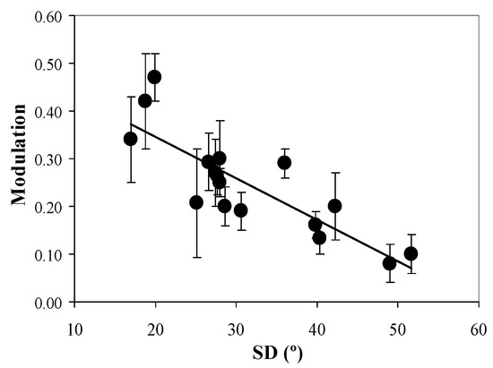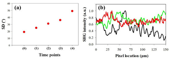 In order to gain more insight into this effect, Figure 11 depicts the values of polarimetric modulation of the SHG images (averages across the entire maps) as a function of SD. A decreasing linear significant correlation is present (R = 0.84, p < 0.0001; best linear fit: Mod = −0.009·SD + 0.52). This means that the higher the collagen organization, the higher the modulation (or alternatively, the sensitivity to polarization).