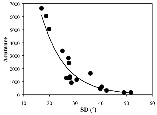 As seen above, the increase in SD within the corneal stroma is closely related to the presence of certain pathologies. In clinical environments, the visualization and analysis of these changes in the collagen arrangement are of relevant importance. Consequently, it is interesting to determine whether the quality of these images is associated with the collagen organization. In relation to this, Figure 6 shows the values of acutance of each SHG image as a function of SD. A significant exponential decay was found for this image quality parameter (R = 0.96, p < 0.0001).
