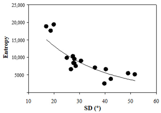 For the sense of completeness, Figure 7 presents the values of entropy also as a function of the SD of each samples. Similar to what occurs with acutance, the entropy was also strongly correlated with SD. This image quality metric also follows an exponential decrease (R = 0.91, p < 0.0001). However, the decay is not as abrupt as that found for acutance.