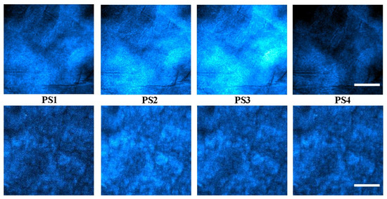 For the second part of the experiment, four SHG images corresponding to the pre-defined PSs (PS1–PS4) were recorded for each sample involved in the study. For each set of four images, the map of polarimetric modulation was computed (pixel-by-pixel) using the following equation: