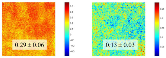 Spatially resolved maps of polarimetric modulation computed from the SHG images in Figure 8. The values in the insets are the averaged values across each map, with the corresponding standard deviation.