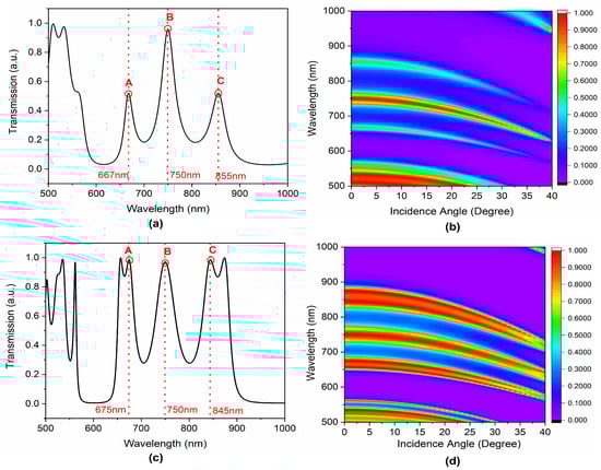 The structure optimizations and analysis are carried out initially for a QPhC structure with n = 6 FS elements. The transmission characteristics of QPhC at normal incidence for n = 6 FS element are shown in Figure 2a. The transmission spectrum is symmetric around the central working wavelength of 750 nm. This is because of the 90-degree phase shift (). The structure exhibits three photonic modes at normal incidence for corresponding central wavelengths of 667 nm, 750 nm, and 855 nm. These are marked as mode ‘A’, ‘B’, and ‘C’, respectively, as shown in Figure 2a. The structure has very high transmission for the central mode; however, the transmission amplitude is decreased for the lower-energy and higher-energy modes. The multimode transmission characteristics of proposed design can further be used in various applications []. The angular dispersion characteristic of these modes is also calculated and represented in Figure 2b. The analysis shows that the transmission characteristic is highly angle dependent and at the higher incidence angle, the modes energies are also higher. Thus, it can be used for multimode photon excitation coupling applications. The transmission characteristics of lower-energy and higher-energy modes can further be improved by increasing the elements in the QPhC structure.
