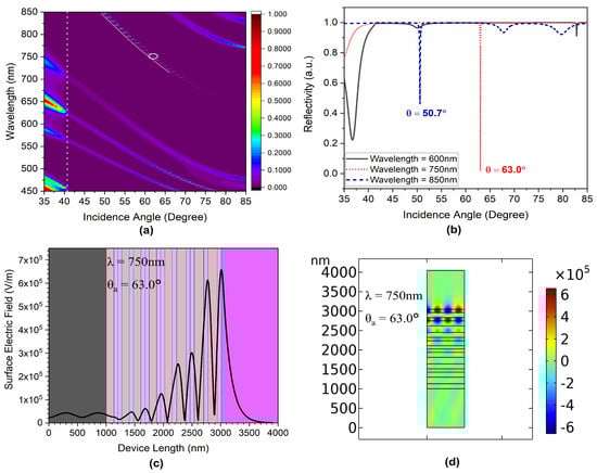 Transmission characteristics of the proposed structure at an oblique incidence angle for n = 7 QPhC: (a) angular dispersion characteristic, (b) angular reflectance characteristic, (c) normalized surface electric field confinement along with the length of the proposed structure for 750 nm operating wavelength at 45.4° incidence angle, and (d) normalized surface electric field confinement structure for 750 nm operating wavelength at 79.0° incidence angle.