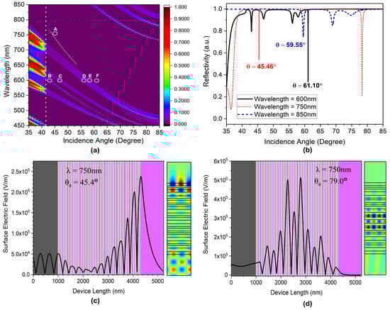 Figure 4 represents the transmission characteristics of the QPhC structure for the seven elements. Modifying the element number alters the dispersive properties of the QPhC structure. This is because of the generation of a number of sub-groups in the XYXYXZ‘ (for n = 7) structure with X = ABBAB, Y = ABBABBAB, and Z‘ = BA. The structure also exhibits several optical modes over the wavelength range of 450–850 nm. Figure 4b represents the angular dispersion analysis of the considered n = 7 QPhC structure for 600 nm, 750 nm, and 850 nm wavelengths. The structure exhibits generation of both surface guided modes and bulk guided mode for most of the wavelengths. For an incident wavelength of 600 nm, the structure exhibits five local minima (at 43°, 46°, 56°, 58°, and 61.10°), as shown by the circle ‘B–F’ in Figure 4a, out of which only mode ‘F’ is represented as top interface guided (OSS);the remaining four are bulk guided or leaky modes. Similarly, for an incident wavelength of 750 nm, the structure exhibits two local minima (at 45.46°, and 79°), out of which a 45.46° incidence angle leads to the excitation of an OSS mode (circle A in Figure 4a); the 79° angle represents the structural guided mode. This can further be confirmed by analyzing its spectral field distribution, as shown in Figure 4c,d.