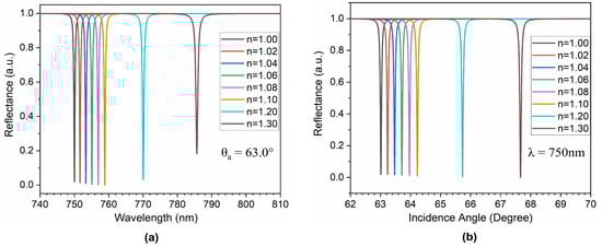 where S is the sensitivity, is the incident angle variation in angular interrogation, and is the operating wavelength variation in wavelength interrogation for the corresponding varying analyte refractive index n. It is evident from Figure 5 that infiltration of analyte at the top interface leads to excitation of the surface mode. However, the operating wavelength (or incident angles) is red shifted, with a very narrow full width half maximum (FWHM). This is because of the increase in the effective index at the top interface, which requires a higher operating wavelength (or incident angle) to confine the surface mode for the specified analyte concentration. This leads to the calculation of a more comprehensive performance parameter figure-of-merit (FOM), which can be calculated by FOM = S/FWHM []. The FWHM represents the width of the reflection spectrum ( or at half of the maximum reflection intensity points. The results are summarized in Table 2. It can be seen from Table 2 that the operating wavelength shifts from 750 nm (for air) to 785.66 (for n = 1.3) at a constant incidence angle of 63.0°, as shown in Figure 5a. The structure possesses a FWHM of less than 1 nm, thus showing its potential application in low concentration analyte detection. This gives an average FOM of about 231.6 RIU.