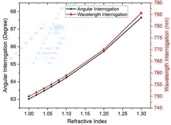 Figure 6 summarizes the angular interrogation (at a fixed operating wavelength) and wavelength interrogation (at a fixed incidence angles capabilities of the structure. The structural wavelength sensitivity response can be measured by Equation (10) and the corresponding angular sensitivity is calculated by Equation (11).
