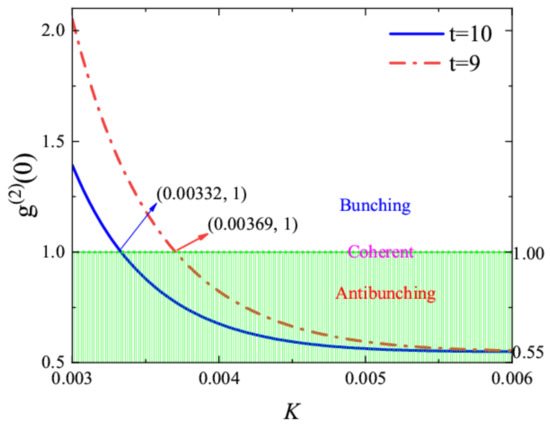 In order to clearly see that the Kerr strength coefficient affects the quantum statistical properties of the single-mode magnon coherent state, we have carried out a direct numerical calculation of for a single-mode field with respect to the Kerr strength K and dimensionless time t. As shown in Figure 3, we can clearly see the bunching phenomena and the fact that the magnon obeys the super-Poissonian quantum statistics discipline when the Kerr coefficient is smaller than 0.0033. When K > 0.0037, we can obviously observe that the magnon exhibits an antibunching effect that occupies a major area in Figure 3. In the cross regime of 0.0033 < K < 0.0037, the second-order correlation function of the magnon appears more complex when the Kerr strength K varies. It is easy to see that, for a single-mode field, may decline rapidly when the Kerr-nonlinearity increases. For the sake of confirming this issue, we have plotted as a function of the Kerr strength K with t = 9 and t = 10, as shown in Figure 4. In order to see this clearly, we draw an auxiliary line (corresponding to = 1) and also mark the transition point position (K = Kt ≈ 0.00332 and 0.00369). In the range 0.003 < K < Kt, the second-order correlation function is bigger than 1; however, of the magnon in the range Kt < K < 0.006 is less than 1. Obviously, the magnon number distribution is a Poisson distribution at the transition point Kt. This implies that the statistical properties of the magnon can be controlled by varying the Kerr-nonlinearity intensity in the photon-magnon system.