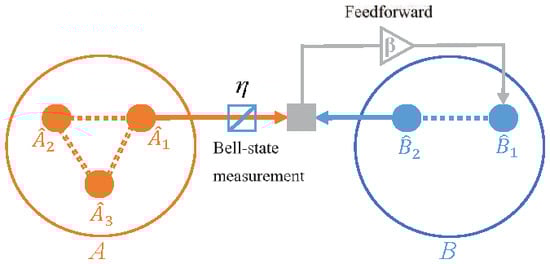 respectively. The measured results of and are fed forward to the mode from bipartite entangled system. Thus, Equations (12) and (14) can be changed into