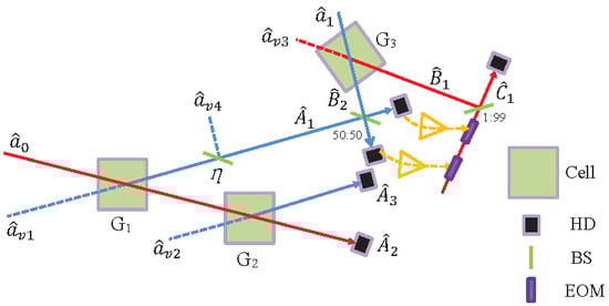 The schematic diagram of the generation of three-mode entanglement is depicted in Figure 1. Two independent quantum entangled systems A and B, are merged into three-mode entangled systems (, , and ). In order to construct three-mode entanglement between two independent quantum entangled systems, optical mode is sent to bipartite entangled system B through a quantum channel with transmission loss in which is used to simulate the unavoidable losses in real quantum channels which will deteriorate the performance of quantum entanglement swapping. A joint measurement on the two modes and is implemented and then the measured results are fed forward with the gain to the optical mode . The remaining optical modes of the two independent quantum entangled systems, i.e., , , and , are projected and entangled. The three-mode entanglement between , , and can be analysed in the detailed setup in Figure 2. As depicted in Figure 2, the input–output relationship of the cascaded FWM processes can be expressed as