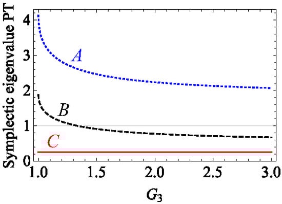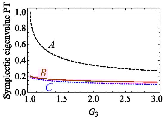 The dependence of smallest symplectic eigenvalues (A), (B), and (C) on power gain G under the conditions of = = 2, , .