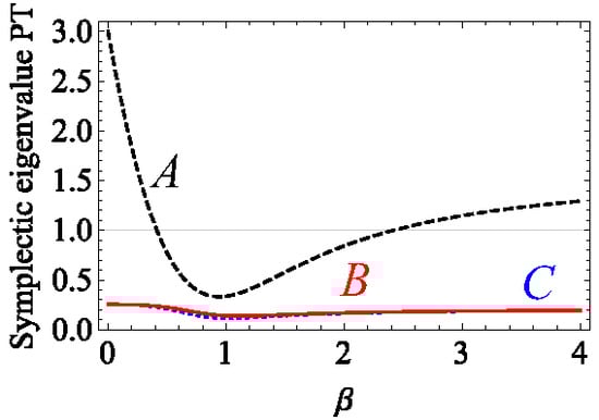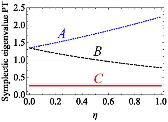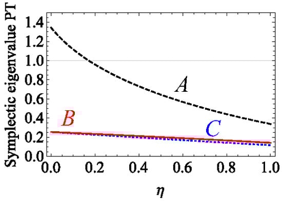 The dependence of smallest symplectic eigenvalues (A), (B), and (C) on transmission loss under the condition of = = = 2 and .