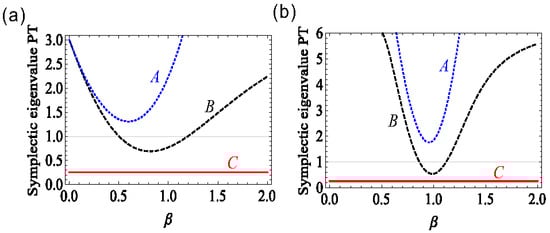 The dependence of smallest symplectic eigenvalues (A), (B), and (C) on feedforward gain under the conditions of and in (a), in (b).