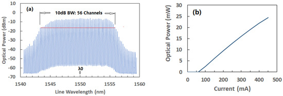 Figure 2a shows the lasing spectrum at a drive current of 400 mA, and Figure 2b single-mode fiber coupled light output of the laser as a function of drive current. During measurements, a heatsink temperature of 18 °C was used. The 3 dB bandwidth of the laser is 9.3 nm, from 1545.8 nm to 1555.2 nm, at a central wavelength of 1550.5 nm with 42 lasing modes. The 10 dB bandwidth is 12.5 nm, from 1543.3 nm to 1555.8 nm, at a central wavelength of 1549.6 nm with 56 lasing modes as indicated in the Figure 2a. For this device, an optical signal-to-noise ratio (OSNR) greater than 60 dB is achieved. Moreover, from Figure 2b, it can be seen that a threshold current of 60 mA and fiber coupled optical power of 24.4 mW at 450 mA are obtained.