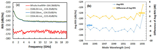 To investigate the RIN for the laser, the RIN spectra including all modes and individual longitudinal modes are measured in the frequency range from 10 MHz to 20 GHz using the Keysight N4371A RIN measurement system; examples are shown in Figure 3a. The RIN values from the entire spectral emission are all below –160 dB/Hz over the 20 GHz frequency range, and an integrated average RIN as low as −164.4 dB/Hz is achieved. The RIN spectra of individual longitudinal modes are assessed by selecting each mode using a tunable optical narrow bandwidth filter. Figure 3a shows a comparison of the RIN spectra of three modes at low (1546.04 nm), center (1550.58 nm), and long (1554.46 nm) wavelength. They all demonstrate similar behaviors and the RIN values measured at high frequencies (>4 GHz) drop down to below −140 dB/Hz for all three modes. Figure 3b shows the integrated average RIN values and the difference of the average RIN from the average value (−133.54 dB/Hz) for 19 selected modes across the wavelength range from 1543 nm to 1556 nm (which contains a total of 56 modes). It is observed that the average RIN is below −132.2 dB/Hz, and the difference is <1.3 dB for the modes between 1543 and 1555 nm. At the long wavelength range close to 1556 nm, the average RIN and the difference are increased to −128.7 dB/Hz and 4.8 dB. However, the measured RIN values of the all-longitudinal modes are below the IEEE standard (−128 dB/Hz) for RIN with Terabit/s communications as demonstrated in [17].