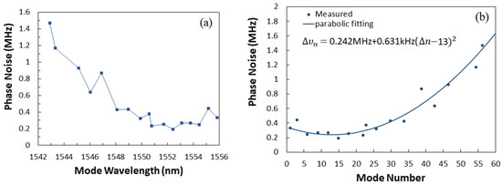 Phase noise of OFC sources is becoming a very critical parameter for higher-order QAM modulation formats [38]. Phase noise normally is presented by optical mode linewidth. Figure 4a shows the measured phase noise for the selection of individual longitudinal lasing modes in the wavelength range from 1543 to 1556 nm. The laser was driven at 400 mA at a temperature of 18 °C. The phase noise is obtained by analyzing the frequency noise spectra using an optical auto-correlator. A narrowband optical tunable filter (EXFO XTM-50) is used for filtering the individual longitudinal lasing modes. The minimum measured phase noise is 0.19 MHz at a wavelength of 1552.4 nm, and all values of phase noise are below 1.5 MHz. The phase noise as a function of mode number is fitted to a parabolic curve, as shown in Figure 4b. A technique for estimating the RF linewidth () from the parabolic curve fitting of phase noise () vs. mode number (Δn) for a SSP MLL has been recently studied [10]. Using the deduced explicit expression as shown in [10] Equation (7), parabolic fitting results of a minimum linewidth of Δυmin = 240 kHz at the 13th mode is extracted for the 28.4 GHz laser with QDot gain material. The first harmonic RF linewidth is then extracted from the parabolic fit giving ∆υRF1 = 0.631 kHz.