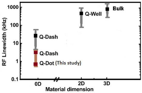 RF linewidth dependence on gain material dimensionality, where Bulk, Q-Well, and Q-Dash (black) are from [49], Q-Dash (brown) from [10].