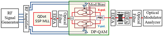 - Mustafa, A.-Q.; Laperle, C.; Charlton, D.; O’Sullivan, M.; Xie, C.; Hui, R. Multichannel 16-QAM single-sideband transmission and Kramers–Kronig detection using a single QD-MLL as the light source. J. Lightwave Technol. 2020, 38, 6163–6169. [Google Scholar]