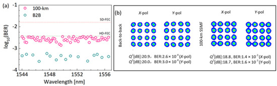 (a) BER evaluation over the mode wavelength range for B2B and after 100 km of SSMF transmission. All the selected channels are below the SD-FEC limit (BER = 2.0 × 10−2) and HD-FEC limit (BER = 3.8 × 10−3). (b) Constellation diagram obtained for a selected channel at 1552.180 nm for both X- and Y-polarization after B2B and 100 km of SSMF transmission. The color indicates the relative density of symbols detected in the complex plane, with red indicating a higher density and blue a lower density.