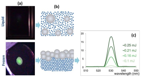 (a) Photo of liquid and frozen suspension with second-harmonic signal; (b) schematic representation of the arrangement of particles in liquid and frozen suspensions; (c) SHG spectrum in a frozen suspension at different pump energies.
