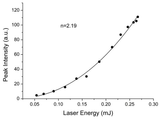 Figure 3 shows the dependences of the intensity of the second harmonic on the pump energy for frozen suspension at nanosecond pump-pulse duration. As is known, second-harmonic output intensity , where L is the sample’s thickness, A is a proportionality constant, —effective SHG coefficient. The experimentally obtained dependence was almost quadratic, with an index of 2.19. Similar dependence was observed for a layer of particles on a substrate and for a powder, at nano- and pica-second pumping durations, which indicates the influence of multiple scattering process on the enhancement caused by the increased trapping of fundamental frequency photons inside the turbid media. At a higher particle concentration, with picosecond pumping, SHG signal was registered, and the dependence of its intensity on the pump energy was also almost quadratic, but with a lower index 1.8. In this case, the influence of the complex absorption and strong scattering inside the particles is not compensated by strong scattering from them.