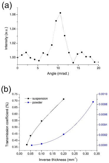 Backscattering intensity as a function of angle for LN powder (a); transmission coefficient dependence on the inverse thickness of samples for liquid suspension and powder (b).