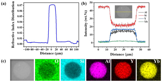 The refractive index distribution of the cross-section of the YCDSF was measured by a refractive index profiler (S14, Photon Kinetics, Inc., Beaverton, OR, USA), as shown in Figure 1a. The refractive index difference between the core and cladding layer was approximately 0.07, and the numerical aperture of YCDSF was approximately 0.46. The cladding and core diameters of the fiber were approximately 200 and 35 μm, respectively. Here, the obtained core-cladding diameter ratio differed from that of the preform, which may be due to the element migration and the interfacial stresses between the molten core and the softened cladding. Furthermore, the elemental distribution of the precursor fiber core was measured by an electron probe micro-analyzer (EPMA-8050G, SHIMADZU, Kyoto, Japan), as shown in Figure 1b. The fiber core contained Al, Y, and Yb elements from the YAG crystal materials. In addition, it can be found that Si spontaneously appeared in the core and cladding layer, indicating that there is an obvious Si diffusion in the YCDSF. The two-dimensional elemental distribution of the YCDSF in cross-section showed the same results, as shown in Figure 1c. The exact concentration of SiO2 in the fiber core was 48.96 wt.%, while the contents of Y2O3 and Yb2O3 were 21.45 and 2.45 wt.%, respectively. The detailed elemental concentrations are shown in Table 1.