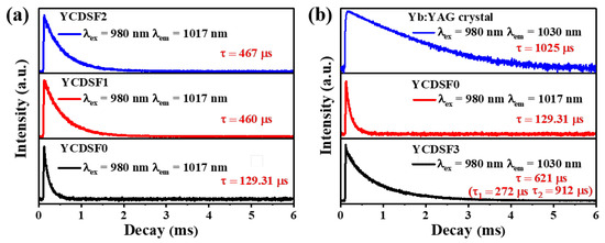 Fluorescence decay curves of (a) YCDSF0, YCDSF1 and YCDSF2, (b) Yb:YAG crystal, YCDSF0 and YCDSF3.