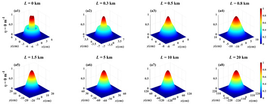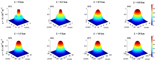 To understand the twist phase induced evolution of the spectral intensity distribution on propagation, Figure 1 shows both the 3D-normalized spectral intensity distribution of the PCLGP beam (η = 0 m−1) and the PCTLGP beam (η = −5 × 10−4 m−1) at several propagation distances in anisotropic non-Kolmogorov turbulence. In Figure 1(a1,b1), one finds that the initial beam profiles of the PCLGP beam and the PCTLGP beam show a multi-ring dark hollow beam profile. From Figure 1(a1–a8), the evolution process of the PCLGP beam can be seen: the spectral intensity in the dark center region gradually increases with the increase in the propagation distance, and the dark ring gradually disappears, and the outer ring gradually degenerates, and finally the beam spot evolves into a Gaussian shape. Similarly, for a PCTLGP beam (see Figure 1(b1–b8)), the spectral intensity distribution gradually evolves to a flat-top distribution, and eventually converges into a Gaussian-like distribution. This is consistent with the conclusions in Refs. [15,31,32,33]: The Kurtosis parameters of the arbitrary beams will converge to a constant 2 as the propagation distance L→∞, which means that arbitrary beams will evolve into a Gaussian shape in atmospheric turbulence with the increase in L. Compared to Figure 1a,b, it can be found that the PCLGP beam evolves into Gaussian distribution more quickly than the PCTLGP beam during transmission, which indicates that the twist phase plays an important role in resistance to the turbulence-induced degeneration.