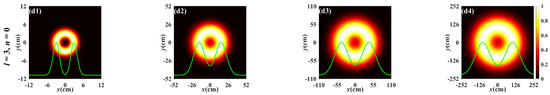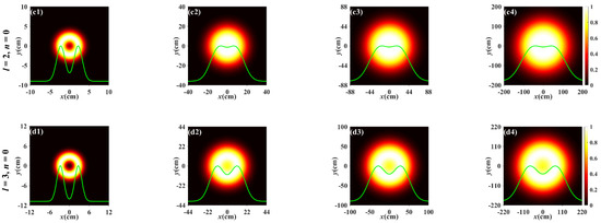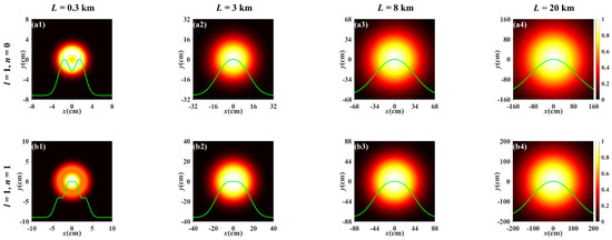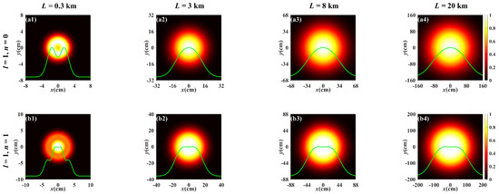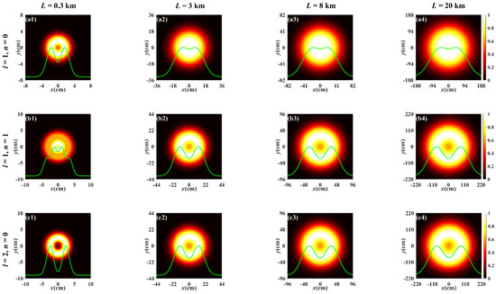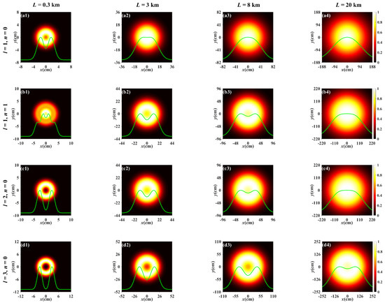 For comparison, Figure 3 depicts the normalized spectral intensity distribution of the PCTLGP beam propagating through the anisotropic non-Kolmogorov turbulence ( = 1 × 10−13 m3−α) at the same propagation distances and the topological charges with Figure 2. Figure 3a–d shows the progress of the normalized spectral intensity distribution for the PCTLGP beam gradually evolves to a Gaussian-like distribution under different mode orders and topological charges. It can be easily found that the degeneration of the PCTLGP beam is accelerated by the stronger turbulence by comparing Figure 2 and Figure 3. It is also found that the PCTLGP beam shows different evolution properties when propagating in weaker turbulence and stronger turbulence. The degradation progress of the beam is accelerated with increasing L when propagating for L > 3 km in stronger atmospheric turbulence, and it eventually converges to a Gaussian-like distribution, while the weakly turbulent atmosphere has little effect on the progress of the beam evolving into a Gaussian-like shape, and only the beam spot becomes lager with the increase in L.