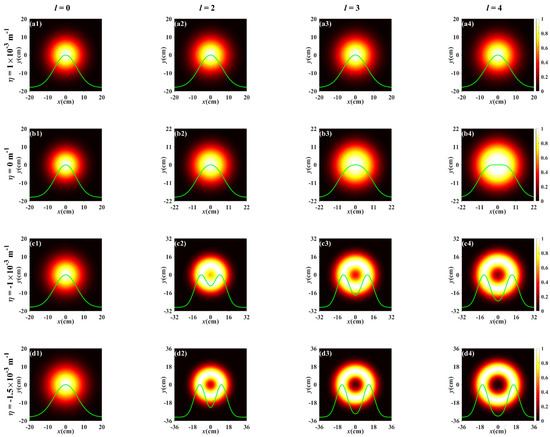 Figure 5 illustrates the evolution of the normalized spectral intensity distribution for a PCTLGP beam with η = −1 × 10−3 m−1 propagating through the stronger turbulence ( = 1 × 10−13 m3−α). Figure 5a–d depicts the degeneration of the PCTLGP beam with different l and n in the turbulent atmosphere. Compared to Figure 3 and Figure 5, it can be seen that the above conclusions obtained from comparing Figure 2 and Figure 4 are also applicable to the stronger turbulence, that is to say, whether in stronger turbulence or weaker turbulence, the PCTLGP beam with a smaller η can more effectively resist the influence of the turbulence on the degeneration. Next, we focus on the effect of the joint modulation of the twist factor and the topological charge on the beam evolution.
