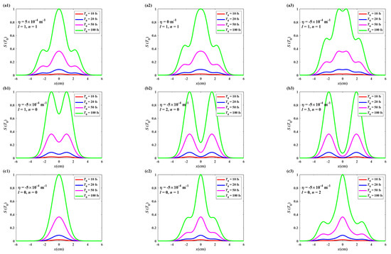 For comparison, we introduce the normalized spectral intensity S(T0) = S(ρ, L; ω)/Smax(ρ, L; ω), where Smax(ρ, L; ω) is the maximum spectral intensity at the points ρ = (x, y) when the pulse duration is 100 fs. Figure 7 illustrates the S(T0) of the PCTLGP beam propagating for 0.3 km in anisotropic non-Kolmogorov turbulent atmosphere under the different pulse durations. Obviously, Figure 7 shows that the overall S(T0) increases with increasing T0. Figure 7a–c illustrates the influence of the twisted factor, the topological charge and the mode order on S(T0), respectively. It can be found that the ability of the PCTLGP beam to maintain the dark hollow shape is enhanced with increasing l, and the dark ring of the beam is more obvious when n is larger. Moreover, the PCTLGP beam degrades more slowly when the sign of the twisted factor is “−”. Therefore, we can draw a conclusion: the PCTLGP beam with a negative twisted factor can more effectively resist the influence of turbulence, and this resistance ability is further enhanced with increasing l, n.