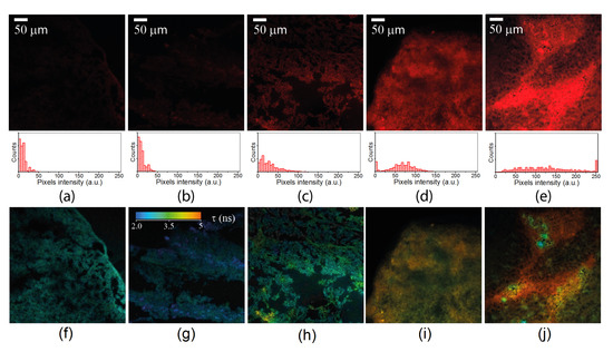 Typical fluorescence intensity images (a–e) and corresponding fluorescence lifetime images (f–j) recorded in the spectral range of 608–683 nm for the five samples: (a,f) control sample of the tumor tissue, (b,g) control sample of the testicular tissue, (c,h) photosensitized tumor tissue exposed to laser radiation prior to sample preparation, (d,i) photosensitized tumor tissue, and (e,j) photosensitized testicular tissue. Histograms of the intensity distributions in the fluorescence intensity images are shown below the images (a–e) for comparison.