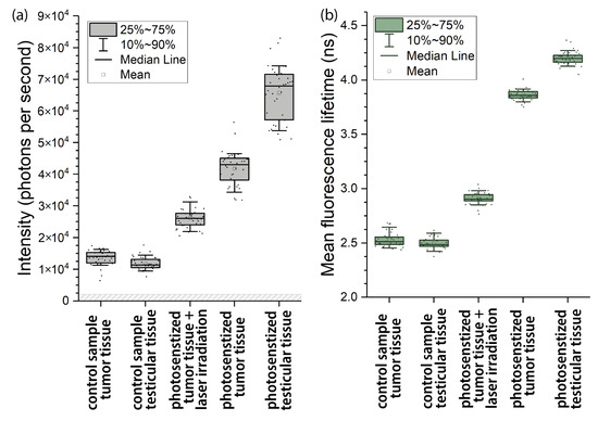 The results obtained are shown in a box-plot form in Figure 2a. In spite of some variations in fluorescence intensity in different fields of view in each sample, a clear difference in the mean fluorescence intensity was observed among the samples. The fluorescence intensity of the control samples of both the tumor and testicular tissues (Figure 1a,b) was nearly the same and had no statistically significant differences, which led to the conclusion that approximately the same concentrations of autofluorescent species were in these tissues.