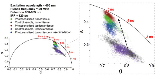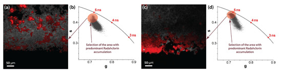 The clearly visible trajectory of the phasor plots corresponding to the increasing PS concentration is indicated in Figure 3, which describes the transformation of the time-resolved fluorescence signal from the control sample (exhibiting autofluorescence only) to the purely single-exponential Radachlorin fluorescence signal. In addition to the comparison of the accumulation of Radachlorin in different tissues, the phasor plot can also be used for the identification of the areas of predominant PS accumulation within the same field of view. To achieve that, one can use the phasor plot reciprocity [52,58] and identify only the pixels that are located close enough to the point of the single-exponential Radachlorin lifetime of about 5.1 ns. An example of such an allocation of the areas with predominant Radachlorin accumulation within a single field of view using the phasor plot is shown in Figure 4 for the samples of photosensitized tissues of a tumor (Figure 4a,b) and testicle (Figure 4c,d).