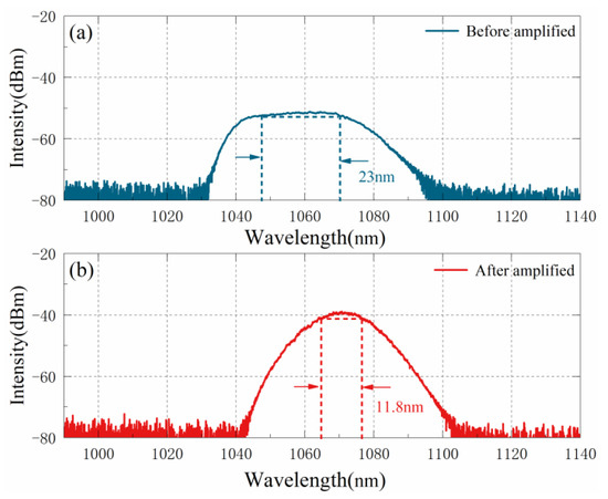 The spectrometer monitors the spectrum of the ASE seed source, as shown in Figure 2a. Its central wavelength is about 1060 nm, and the FWHM is 23 nm. The spectrum of the ASE seed source is relatively flat at 1040–1060 nm. The spectrum after first-level amplification is shown in Figure 2b. After the power amplification, the FWHM decreases to 11.8 nm, and the central wavelength shifts to 1073 nm. The appropriate signal degenerate point in the broadband phase-matching process is analyzed and calculated, and the idler bandwidth at the degenerate point is simulated.