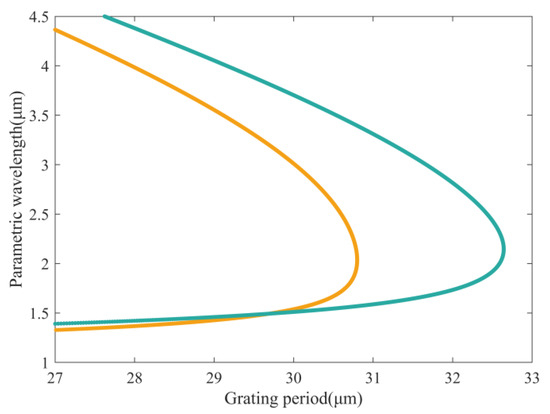 As shown in Figure 3, in the tuning curves of the 1018 nm and 1073 nm lasers, the phase-matched point is obtained when the crystal grating period is 29.69. The signal beam generated by the OPO is degraded at 1.493 μm, and the phase-matched DFG is generated between the signal beam generated by the 1073 nm and 1018 nm lasers. The phase-matched bandwidth of the ASE source in the frequency conversion process is calculated. For the injected pump beam, the phase-mismatched can be expanded into a series at the central wavelength λ0 [23], as shown by the following equation: