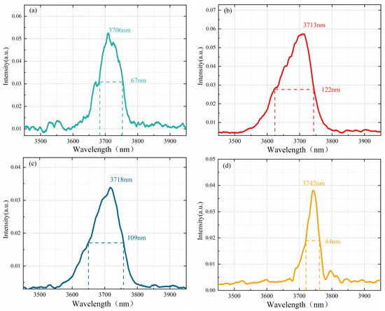 Mid-infrared lasers play an indispensable role in many fields, such as space communication [1], medical applications [2], industrial processing [3], and military confrontation [4]. Different types of mid-infrared lasers have their advantages in performance, and the research generally focuses on developing lasers with higher power, higher efficiency, and even a wider spectral bandwidth [5,6,7,8,9]. The broadband mid-infrared laser can be absorbed by many gas molecules and has been used to monitor the concentration of various gas substances in the industry [10,11]. In addition, the broadband mid-infrared laser covers the absorption peaks of many specific functional groups of organic molecules and plays a significant role in biomedicine [12]. The 3–5 µm laser has attracted much attention in the mid-infrared wavelength due to its high air transmission rate [13]. Meanwhile, the absorption and emission characteristics of cobalt-doped II-VI gain media are in the 3–5 µm spectral region. There is excellent progress in their development, if a mid-infrared laser that is stable and broadband at room temperature is available as a pump source [14,15].