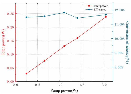 The 1018 nm laser is turned on and the power is increased to 46 W. After the signal beam forms a stable oscillation in the cavity, the ASE source is turned on. Figure 6 shows the pump and idler power curve and the pump–idler conversion efficiency curve. When the pump power is 0.25 W, the DFG process can take place, and the idler power is 28.7 mW. As the pump power is increased from 0.25 W to 2.04 W, the DFG idler power is increased to 238 mW, and the conversion efficiency is maintained at 11.4–11.8%, as shown by the pump–idler conversion efficiency curve.
