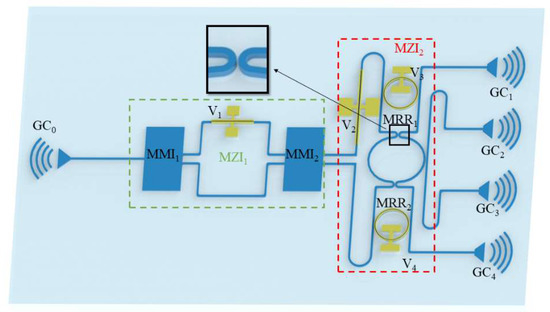 Structure of the silicon waveguide-based Fano resonant component. GC: grating coupling, MMI: multimode interferometer, MZI: Mach-Zehnder interferometer, MRR: micro-ring resonator.