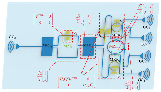 where and are phase shifts adjusted by V1 and V2, respectively. and are amplitude responses of MRR1 and MRR2, respectively. Each matrix represents the corresponding components, which are illustrated in Figure 2. At the right end of Equation (1), represents the two optical signals from the output port of MMI1. Next, represents the phase shifts of MZI1 adjusted by V1. Then, represents the transmission matrix of MMI2, and represents the transmission matrix of the MRR1 and MRR2. At the left end, represents the transmission matrix of the coupling region in MRR1 and MRR2. Similarly, the only difference in Equation (2) is that there is an added matrix , which represents another coupling region between the ring waveguide and bus waveguide. This method’s theoretical derivation provides a basis for subsequent photonic integrated circuit simulation.