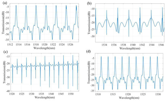As seen from Figure 4a to Figure 4d, all four ports (from GC1 to GC4) can output corresponding Fano resonance spectra, and the spectral performances of the Fano resonance output from the four ports are different. Since the performance of each port is different, the optimal ER and SR of each port are at different wavelength ranges. The port at GC1 can output a high ER for Fano resonance, and the ports at GC2 and GC3 can output high SR for Fano resonance. The ER and SR of each port are different, and we can choose the port according to the needs. At the GC1 port, the ER and SR are 23.73 dB and 65.09 dB/nm. At the GC2 port, the ER and SR are 19.49 dB and 974.39 dB/nm. At the GC3 port, the ER and SR are 15.71 dB and 1989.86 dB/nm. At the GC4 port, the ER and SR are 16.48 dB and 55.33 dB/nm.