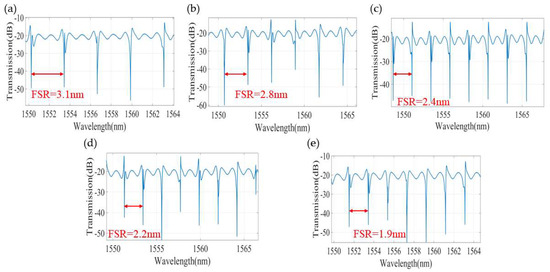 The free spectral range (FSR) is an important performance parameter for the signal multiplexing capability. The FSRs of different Q-factors for MRR1,2 are shown in Table 1. When the Q-factors of MRR1,2 are determined, the FSRs of the four ports are fixed as the same value. Herein, for simplification, only the FSRs of the GC3 port are illustrated in Figure 5. Obviously, the higher the Q-factor is, the lower the FSR is. Therefore, the FSR can be adjusted by changing the Q-factor. The Q-factor is mainly related to the radius of the MRR and to the coupling gap between the ring waveguide and the bus waveguide.