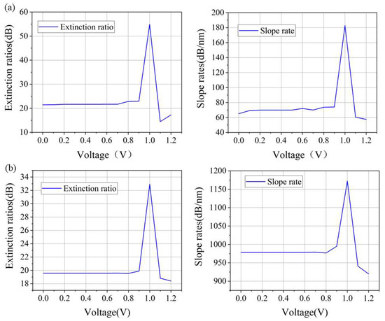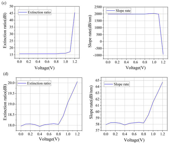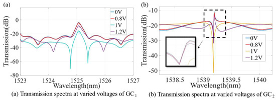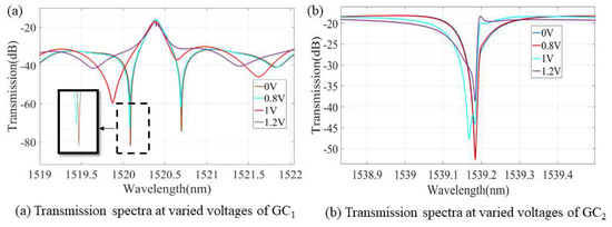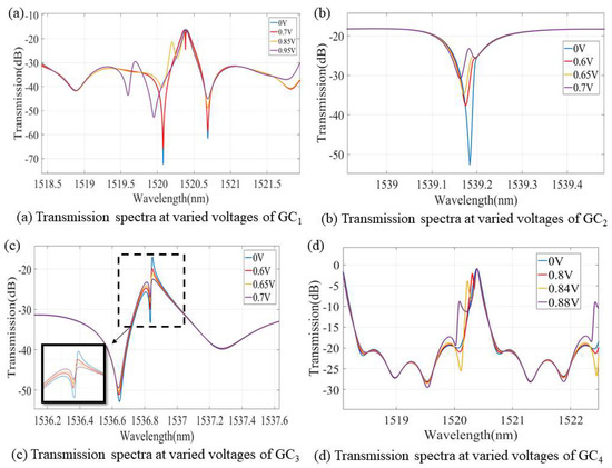 ER and SR of four ports are shown from Figure 7a to Figure 7d, respectively, with different V1. At the GC1, the ER can tune from 23.73 dB to 54.86 dB, and the SR can tune from 65.09 dB/nm to 182.85 dB/nm. At the GC2, the ER can tune from 18.40 dB to 32.92 dB, and the SR can tune from 919.94 dB/nm to 1172.36 dB/nm. At the GC3, the ER can tune from 14.71 dB to 47.08 dB, and the SR can tune from −941.62 dB/nm to 2037.95 dB/nm. The switch between positive SR and negative SR can be realized at the GC3 port. At the GC4, the ER can tune from 17.98 dB to 20.06 dB, and the SR can tune from 57.89 dB/nm to 64.72 dB/nm. The four ports have different performances. Moreover, each port has a different spectral performance after applying voltage.