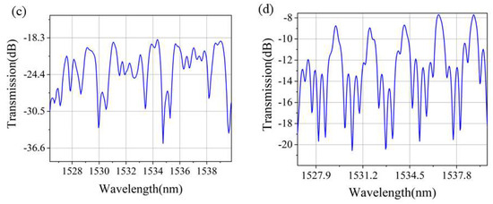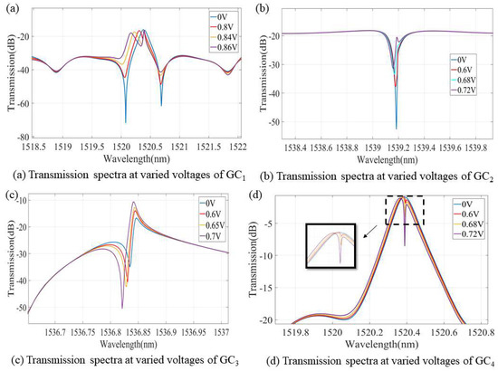 After adjusting V1 to output the optimal ER and SR state, it can adjust V2. V2 tuned the phase difference between the high Q-factor MRR and the low Q-factor MRR. The phase cannot be observed in the spectrum. However, the phase that is adjusted can also change the light intensity amplitude. Thus, the transmission spectra resulting from adjusting V2 are shown in Figure 8. Therefore, the spectrum can also be optimized by adjusting V2 to obtain a higher ER and SR. The highest ER of the GC1 port is 56.19 dB, and the highest SR of the GC1 port is 184.27 dB/nm. The highest ER of the GC2 port is 32.92 dB, and the highest SR of the GC2 port is 2175.74 dB/nm. The highest ER of the GC3 port is 16.61 dB, and the highest SR of the GC3 port is 2102.39 dB/nm. The highest ER of the GC4 port is 18.37 dB, and the highest SR of the GC4 port is 64.72 dB/nm.