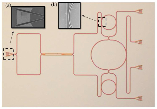 We fabricate the designed silicon photonics component to verify the above theoretical simulation. Figure 11 displays its optical microscope image. The waveguide is a silicon-on-insulator (SOI), whose top silicon layer has a thickness of 220 nm and a width of 0.45 μm, and whose buried dioxide layer (silica) has a thickness of 2 μm. The total size of this component is 780 um × 520 um. The fabricated size was consistent with the above simulation size. Electron beam lithography and inductively coupled plasma etching are employed to define the components. The grating is zoomed in on in the scanning electron microscope (SEM) image shown in Figure 11a. The coupling region of the MRR is zoomed in on in the SEM image shown in Figure 11b.
