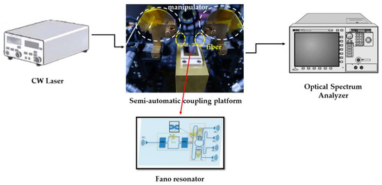 Fano resonance is generated by the mutual coupling of discrete and continuous states, and its spectrum shows sharp asymmetric lines. Fano resonance can effectively enhance the ability of all-optical signal processing. Moreover, it has been applied to high-sensitivity sensing [1], optical switches [2], and silicon modulators [3]. The high integration of silicon photonic components and their compatibility with Complementary Metal Oxide Semiconductor (CMOS) techniques have prompted them replacing traditional optical components. Silicon photonic crystal nanobeam cavities (PCNC) [4,5], micro-ring resonators (MRRs) [6,7], and Mach-Zehnder interferometers (MZIs) [8,9,10] have been reported to achieve Fano resonance. Herein, the PCNC structure [11] has a strong confinement effect on photonics, so the discrete light mode is laterally coupled with the continuous mode, quasi-continuous mode, and photonic crystal bandgap edge mode [12]. Thus, Fano resonance can be obtained by PCNC. However, the photon lifetime of PCNC is low [13] due to its periodic holes. The extinction ratio (ER) and slope rate (SR) are two essential parameters to characterize the transmission spectrum of Fano resonance. ER refers to the light intensity difference between the valley and peak of the Fano spectrum, and SR (also called spectral resolution) refers to the change rate of the light intensity with respect to the wavelength between the valley and peak of the Fano resonance. Generally, Fano resonance with high ER and SR is effectively helpful for improving the component performance, such as the response rate and sensitivity for the optical switcher, silicon modulator, optical sensor, and so on. In addition, the machining process of PCNC is comparatively challenged, and the slope rate (SR) and extinction ratio (ER) of the Fano spectra are also low—the ER of the reported Fano resonance produced by PCNC is around 20 dB [4,14,15]. However, as a silicon photonic classical structure, MRR has a high photon lifetime and compact structure. The resonance mode of this MRR structure is usually regarded as the discrete mode so that this discrete mode coupled with continuum/quasi-continuous modes of other silicon waveguide structures can achieve various Fano resonances [8].