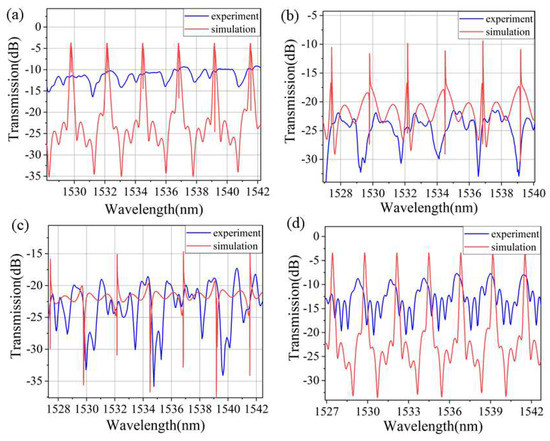 The comparison of transmission spectra between simulation and experiment at (a) GC1, (b) GC2, (c) GC3, and (d) GC4.